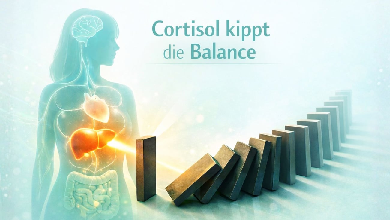Du versuchst vielleicht, jeden Domino-Stein einzeln zu reparieren. Du nimmst Hautcremes gegen Akne, Hormone gegen PMS oder Probiotika gegen Blähungen. Aber solange der erste Stein – Cortisol – nicht stabilisiert wird, fallen die anderen immer wieder.
