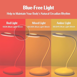 【Zirkadianer Rhythmus, Licht & Schlaf】Unsere Schreibtischlampe lässt Sie zwischen bernsteinfarbenem und rotem Licht wählen. Das bernsteinfarbene Licht (1600K) enthält fast kein blaues Licht, und das rote Licht (625nm) enthält überhaupt kein blaues Licht. Nachts hilft es, helles weißes Licht zu vermeiden, damit Ihr Körper Melatonin produzieren kann, was Ihnen hilft, schneller einzuschlafen und besser zu schlafen.